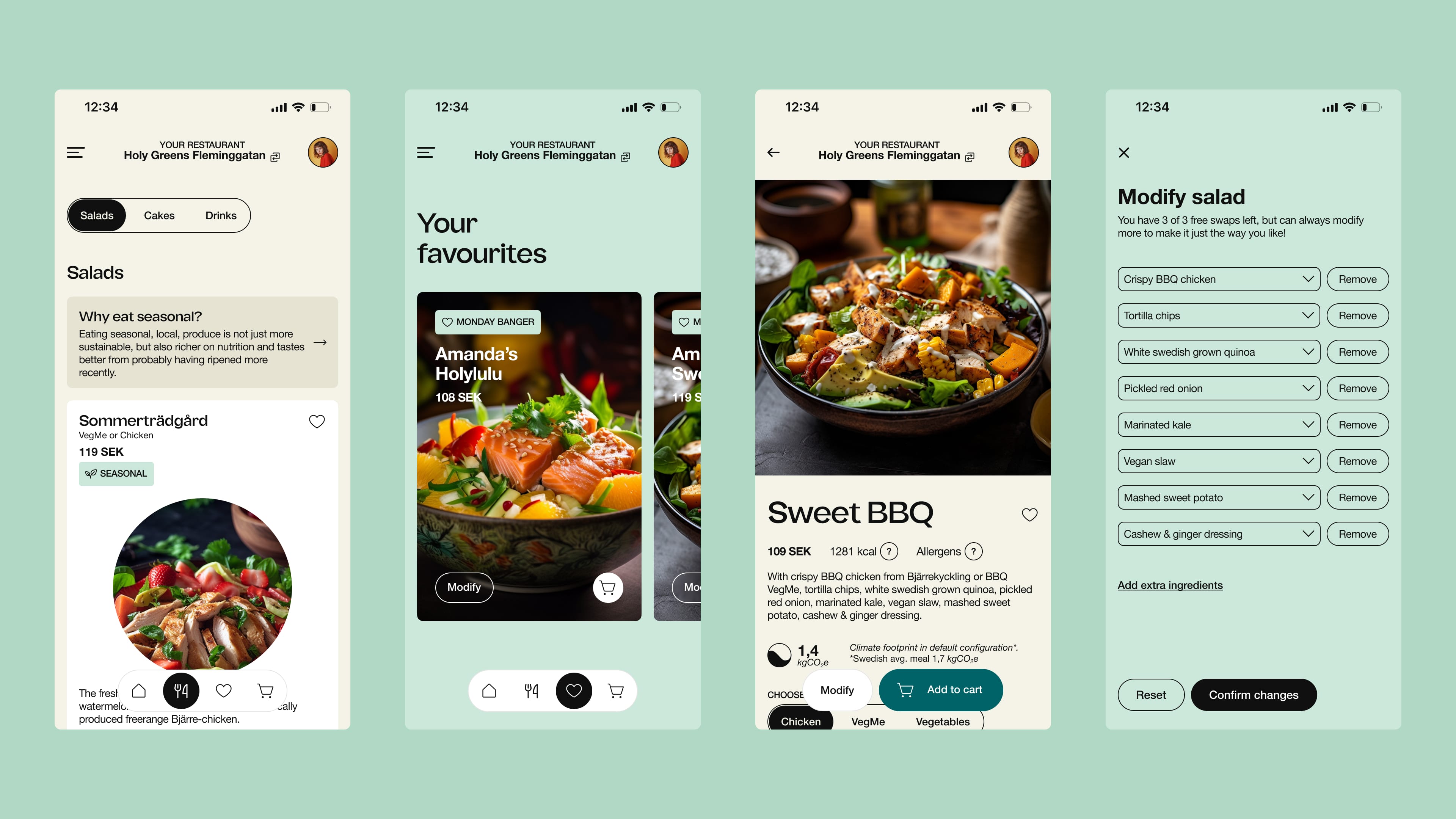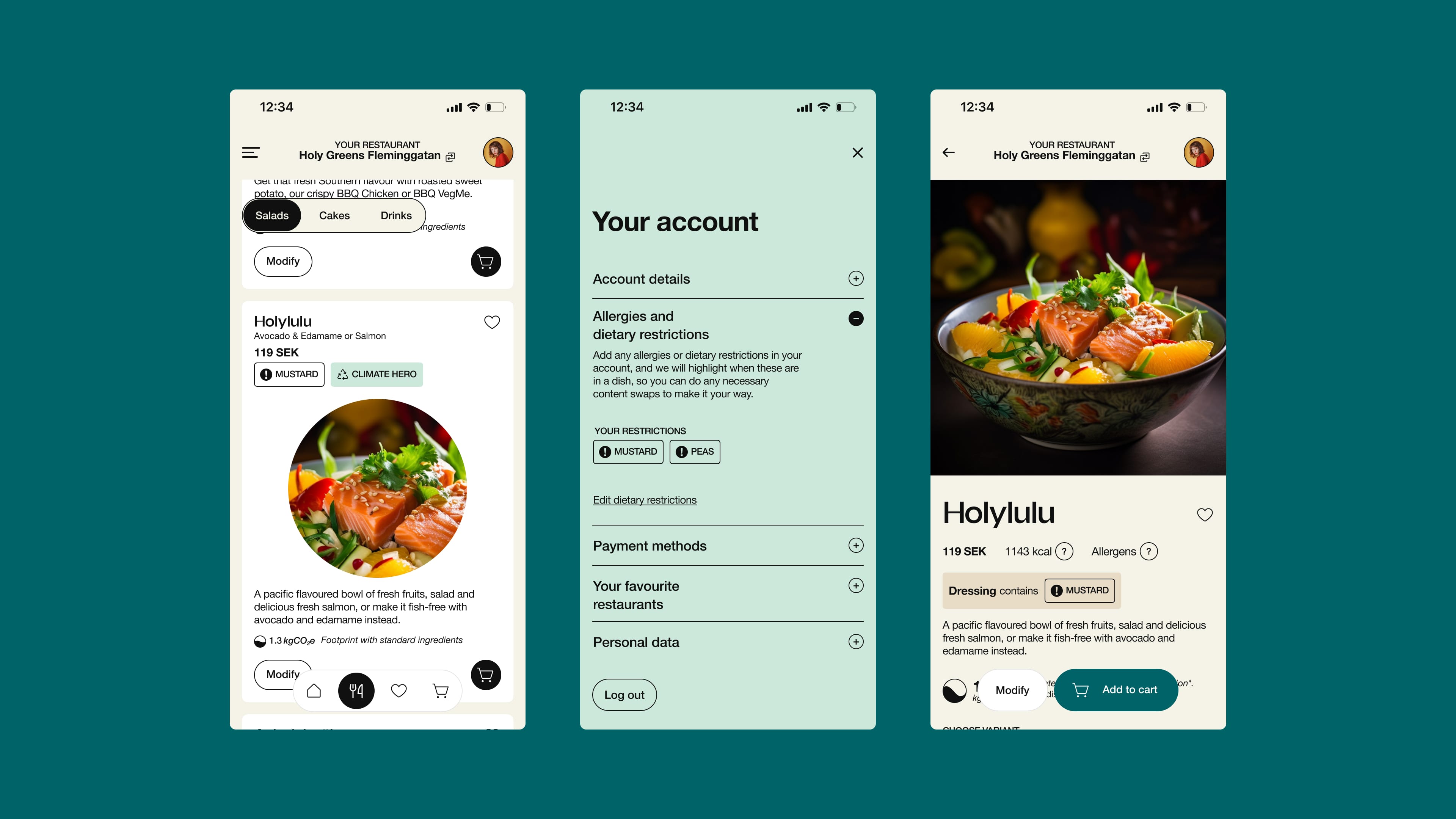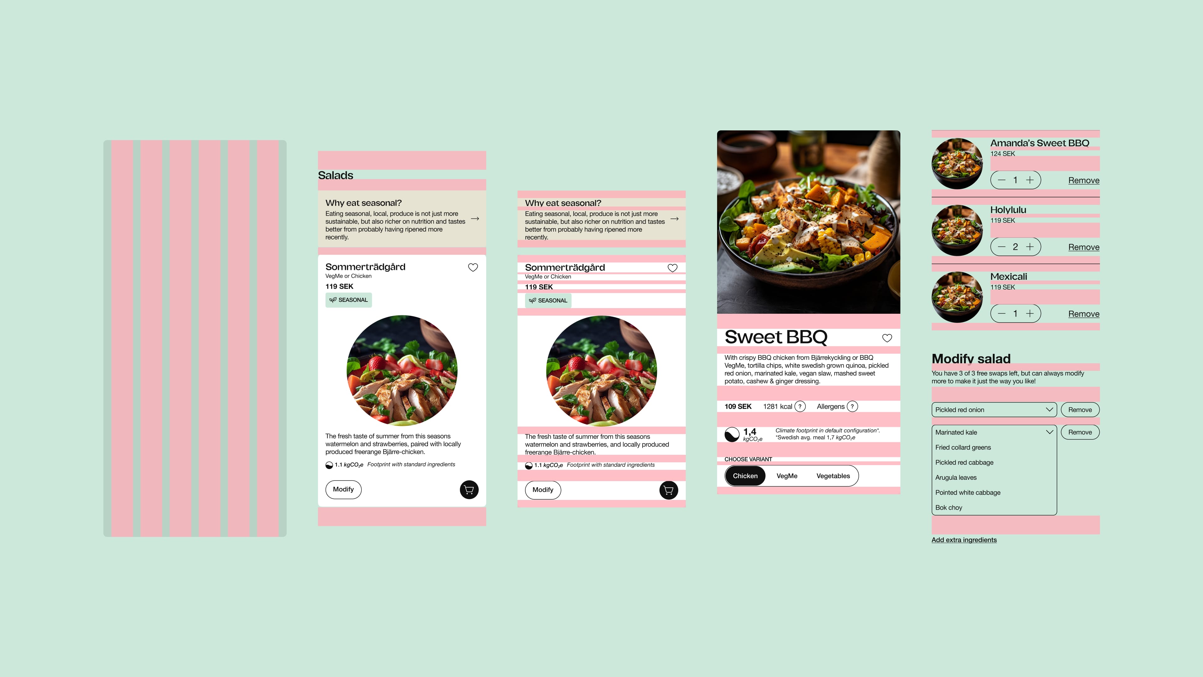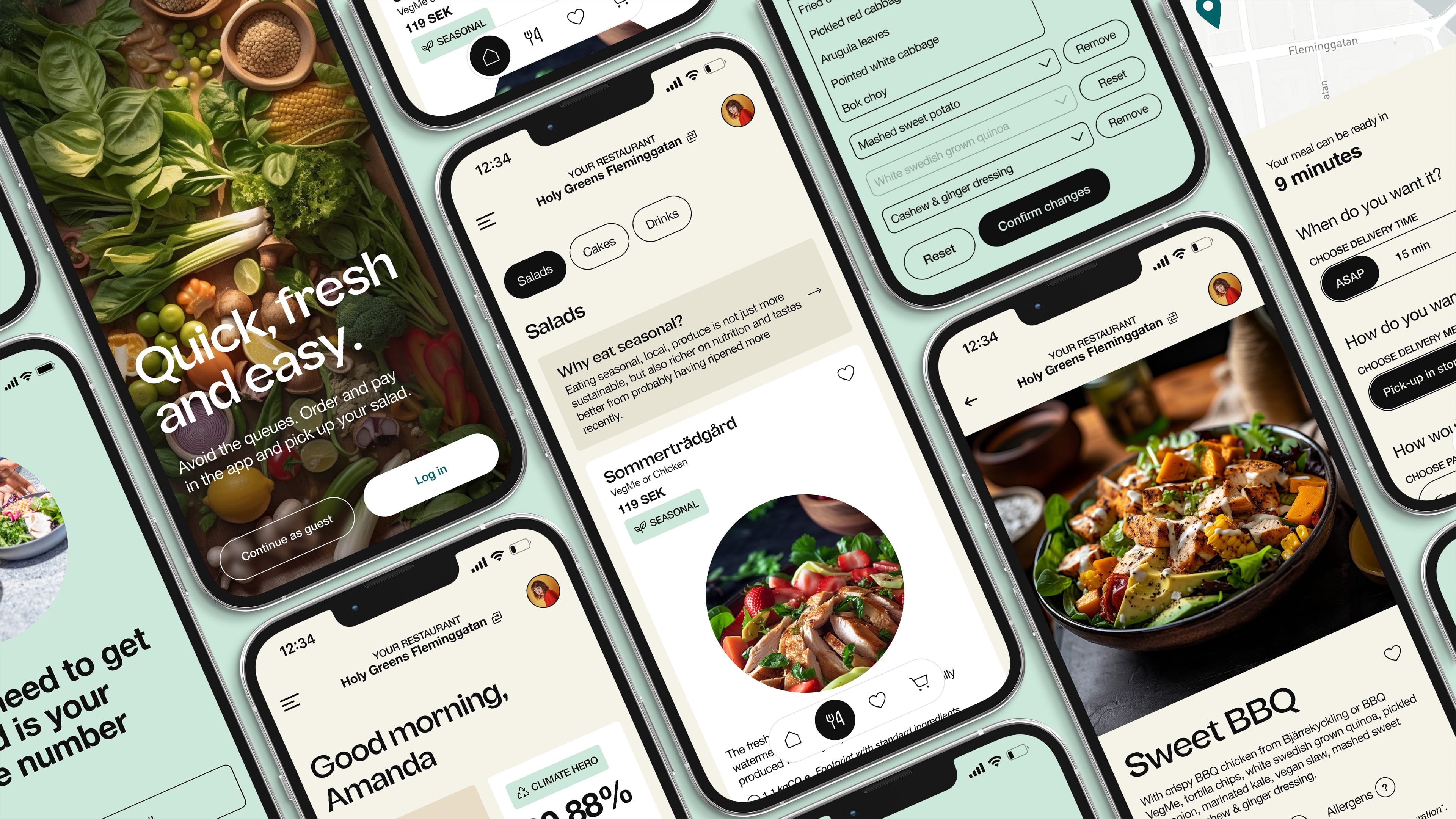 Easy access to the dishes from homepage, menu or stored favourites. Quick-buy or go to a full product page to learn about ingredients, nutrients, allergens, climate footprint, modify salad or purchase the standard variants.