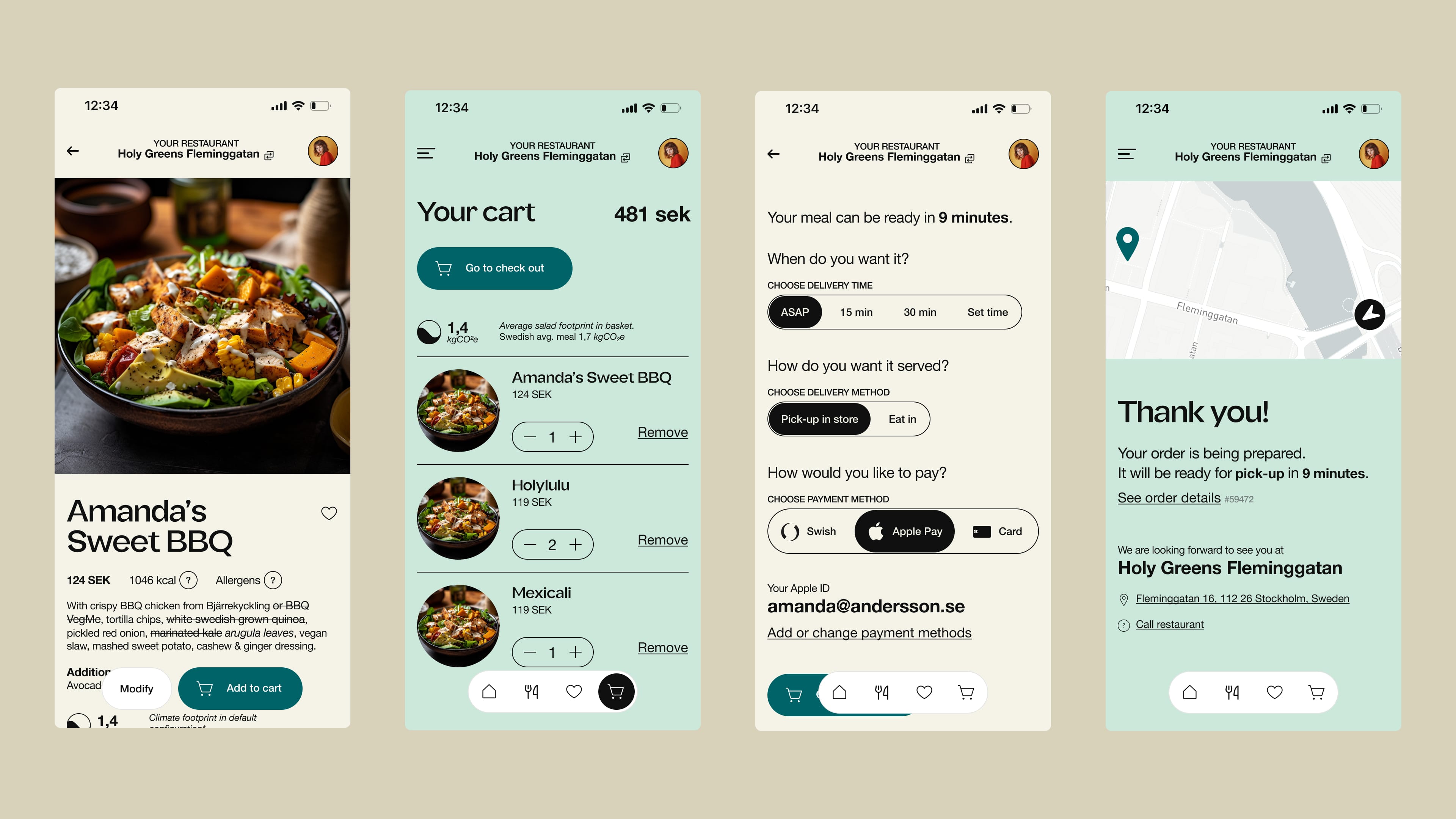 Checking out through the cart, the user get an overview of their order, before choosing when and how they want the salad, and performs the payment directly in app before picking up in their nearby Holy Greens.