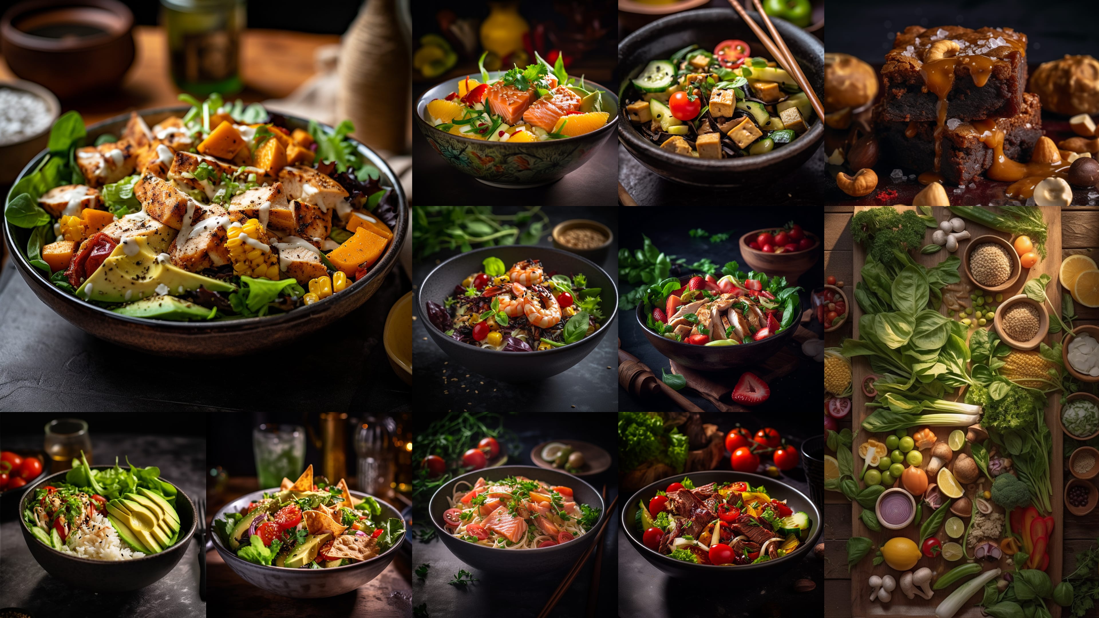 Or ‘photography’, as they are all visualisations generated in Midjourney. Due to a lack of product photos, I wrote a set of prompts for Midjourney that simulates food photography, sprinkled with ingredients from the different items on the menu – except drinks which we had original artwork from manufacturers.
